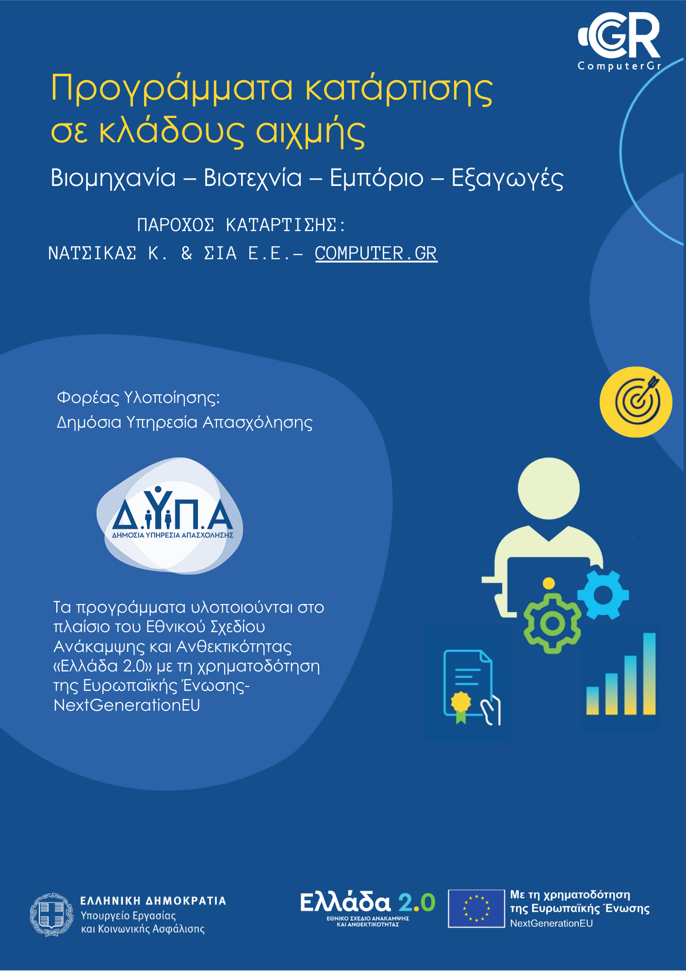 Η Δ.ΥΠ.Α. το προσεχές διάστημα θα υλοποιήσει νέα προγράμματα κατάρτισης για περίπου 𝟯𝟬.𝟬𝟬𝟬 ανέργους σε όλη την Ελλάδα, με στόχο την αναβάθμιση δεξιοτήτων σε ειδικότητες που ζητάει η αγορά εργασίας (Κλάδοι Βιομηχανίας, Βιοτεχνίας, Εμπορίου και Εξαγωγών)!
